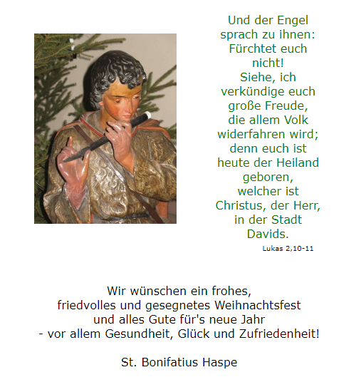 Auf Grund der aktuellen » KDG dürfen wir auf unseren Seiten keine (Personen-) Foto's oder Namen mehr veröffentlichen. Daher gibt es hier vorerst auch keine aktuellen Gruppenfoto's der Erstkommunion oder der Firmung. Auch die aktuellen Messdiener- und Lektorenpläne dürfen nicht mehr veröffentlicht werden. Die "alten" Bildergalerien sowie die Hinweise auf die Gemeindegruppen mit Namen und evtl. Telefonnummer der Ansprechpartner /-innen haben wir erhalten, damit diese Seite nicht zu einer "toten" Seite wird. Sollte jemand mit seinem Namen, Telefonnummer und / oder Bild auf diesen Seiten nicht einverstanden sein, bitten wir um kurze formlose Nachricht an internet@st-bonifatius-haspe.de. Die Daten werden dann schnellstens entfernt. Sollte sich hier in Bezug auf den Datenschutz etwas ändern, werden wir die Foto's hier wieder einstellen! Danke für Ihr Verständnis.
