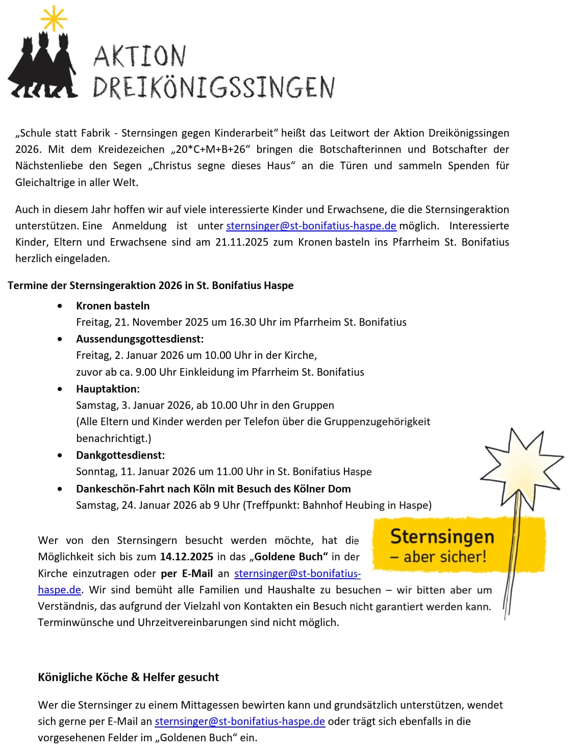 Anfragen an die Sternsinger in St. Bonifatius Haspe: Birte Hoffmann-Bahr Kristina Callsen . |