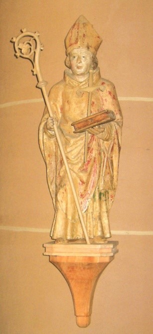 an der rechten Halbsäule neben dem Altar (Lindenholz, 72 cm hoch), ist eine Figur aus der Zeit um 1500 (Expertise vom Direktor des Paderborner Diözesanmuseums). Sie war ursprünglich farblich gefasst, die Spuren davon sind noch zu erkennen, aber nicht mehr so deutlich, dass man sie in den Originalfarben wiederherstellen könnte. Die Krümme des Bischofsstabes und das vom Schwert durchstochene Buch wurden bei der Restaurierung (durch Richard Dertinger aus Paderborn) erneuert.