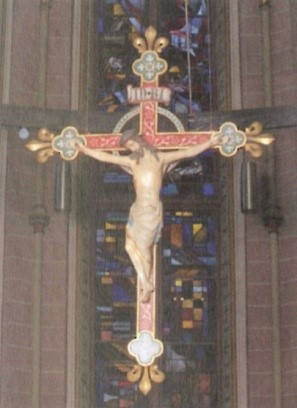 Durch eine Spende haben wir am Ende der Innenrenovierung der Kirche in den Jahren 1989/90 das Kreuz über dem Altar erhalten. Es ist ein Triumphkreuz, um 1880 in Frankreich entstanden, also etwa aus der Bauzeit unserer Kirche. Das Corpus ist aus Terracotta. Die Enden der Kreuzesbalken sind mit goldenen Lilien verziert, wie sie auch in den ausgemalten Laibungen der Fenster im Chorraum zu sehen sind. Das Kreuz ist 115 cm hoch. Es stammt aus dem reichen Schatz des Kunstsammlers Prof. Dr. Hartmut Riemenschneider und wurde von den Architekten Krug und van der Minde aus Hagen gestiftet, die die Innenrenovierung der Kirche geleitet haben.
