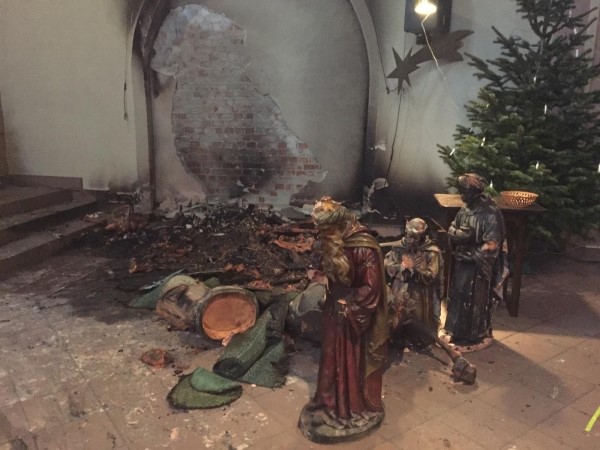 Bis am 5. Januar 2021, zum Glück, unser Küster Hans Kamitter in die Sakristei musste, und dort Qualmgeruch wahrnahm. Geistesgegenwärtig rief er die Feuerwehr und dann Pfarrsekretärin Frau Viße und Herrn Pastor Rehwald zu Hilfe. Herr Rehwald schnappte sich einen Feuerlöscher und begann, den Brand zu löschen. Kurz darauf kam die Feuerwehr, löschte die Reste unserer Krippe und vertrieb den Qualm aus der Kirche. Jetzt musste die Kirche komplett gereinigt werden, alle Wände, alle Bänke, der Altar, der Ambo, die Orgeln, die Paramente, der Fußboden, alles war mit einer schwarzen, öligen, schadstoffhaltigen Rußschicht überzogen. Die Brandursache ist bis heute ungeklärt. Nach erfolgter Reinigung, Renovierung und Innenanstrich konnte die Kirche am 3. Oktober 2021 wieder eröffnet werden.