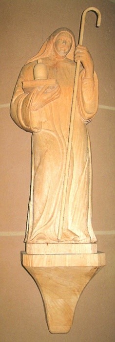 an der linken Halbsäule neben dem Altar, wurde als Stiftung eines Gemeindemitglieds im Jahr 2000 in der Kirche aufgehängt. Die » Kapelle auf dem Spielbrink (1987 gebaut, vorher in Wachtendonk im Kreis Kleve als evangelische Kirche, sogenannte Bartning-Notkirche aus dem Jahre 1952) wurde nach Lioba benannt, einer Mitarbeiterin und Verwandten des hl. Bonifatius. Sie ist also seit 1987 neben Bonifatius eine Patronin unserer Gemeinde. Die Figur wurde eigens für uns angefertigt von dem Holzschnitzer Norbert Holzheimer aus der Rhön, und zwar aus Lindenholz. Die Merkmale der hl. Lioba sind der Äbtissinnenstab (vergleichbar mit einem Bischofsstab) und eine Glocke (kommt in ihrer Berufungsgeschichte vor). Als Vorbild für diese Figur galt dem Holzschnitzer die jugendlich beschwingte Lioba-Figur am äußeren nördlichen Querschiff der Stadtkirche St. Martin in Tauberbischofsheim.