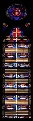 Die übrigen Fenster haben eine ornamentale Gestaltung: die Seitenfenster im Chorraum, die Rosetten über den Heiligenfenstern, die Fischfenster hoch über den Türen zur Sakristei und zur Werktagskapelle; der Fisch ist ein altes Symbol für Christus, weil die Buchstaben des griechischen Wortes für „Fisch“ auch als Anfangsbuchstaben von Bezeichnungen für Jesus verstanden werden können: Jesus, Gesalbter, Sohn Gottes, Erlöser.