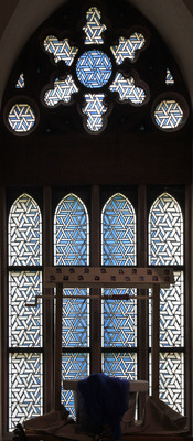- die Symbole für die drei Hochfeste (Stern, Kreuz und Taube) oben in den Chorfenstern.