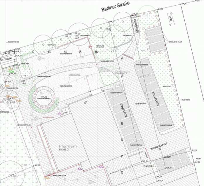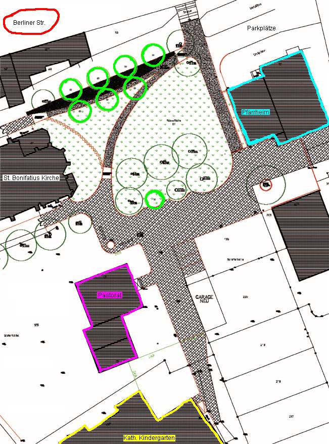 Und ein weiterer Bauabschnitt folgt erst später, nämlich die Herrichtung der Parkplätze östlich vom Pfarrheim und die Gestaltung des Platzes zwischen Pfarrheim und Berliner Straße.